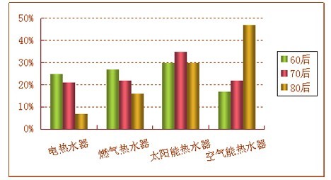 統計顯示,60,70后60人群太陽能水加熱器,電水加熱器和燃氣水加熱器的意向使用逐漸減少的程度,而使用空氣能熱水器增加逐漸,趨勢是明顯。