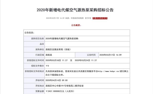 聚陽空氣能中標蠡縣2020年農村地區煤改電地源熱泵改造項目