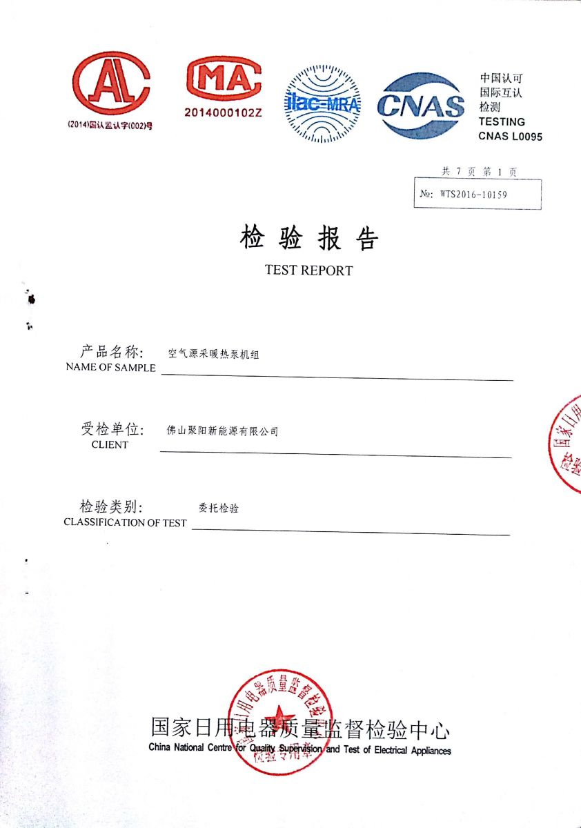 佛山聚陽新能源有限公司通過國家日用電器質量監督檢驗中心對空氣源采暖熱泵機組的委托檢驗,這為我們的空氣源采暖熱泵機組具有國家“煤改電”招標資格提供了一個有力的證明。