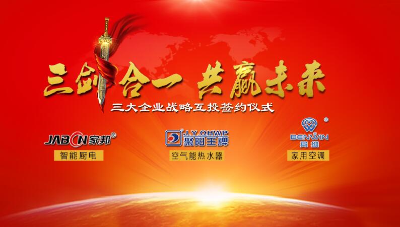 2020年4月2日,聚陽(空氣能)、家邦(廚電)、賓維(空調)三大企業“三劍合一,共贏未來”戰略互投簽約儀式在聚陽公司內部圓滿舉行!
