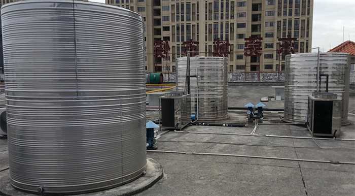 聚陽節能為您解決:根據實際用水情況,定做大容量的保溫水箱,保證集中時段穩定熱水供應。